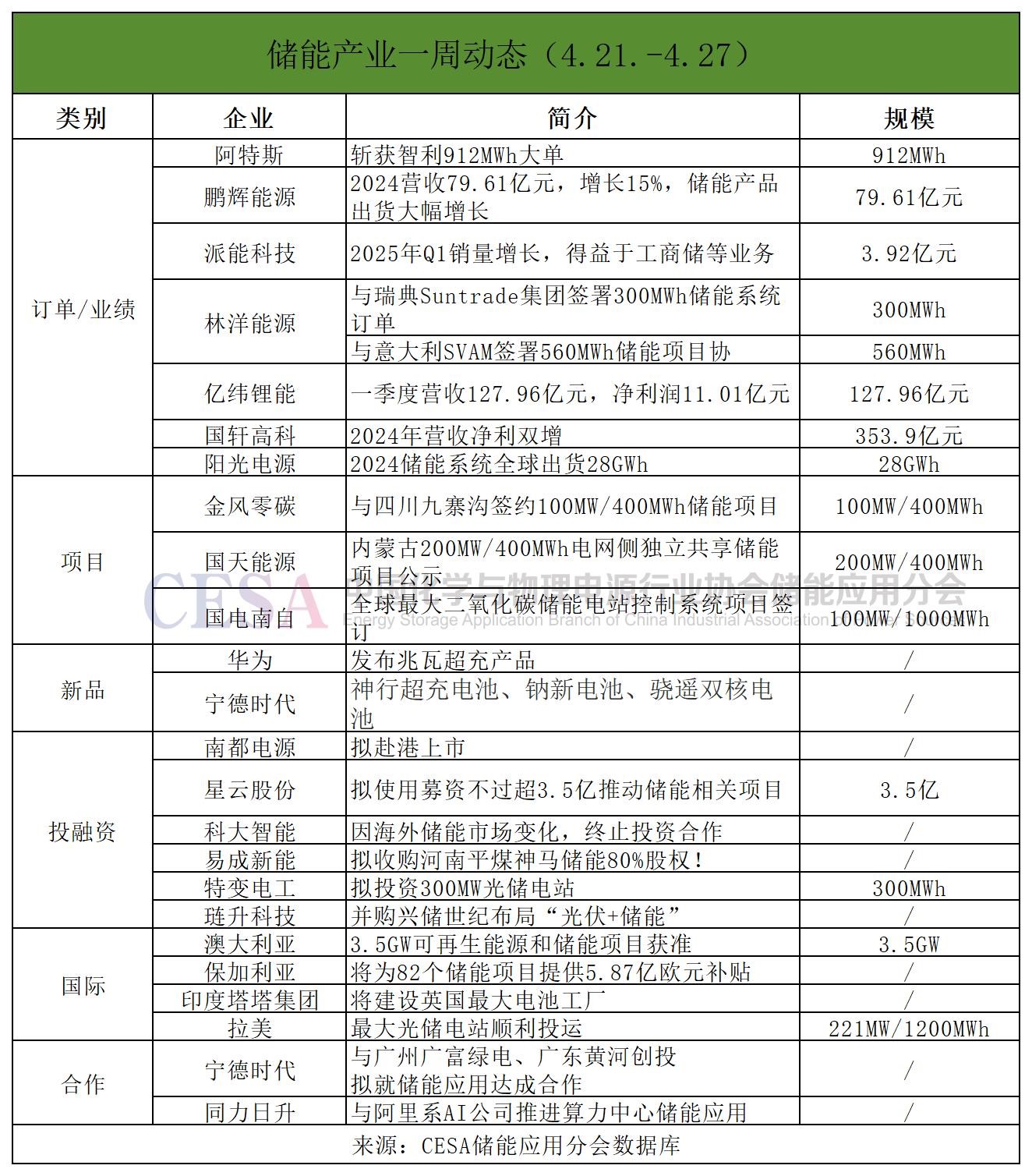 訂單/業(yè)績(jī)方面,陽(yáng)光電源2024儲(chǔ)能系統(tǒng)全球出貨28GWh;國(guó)軒高科2024年?duì)I收凈利雙增;億緯鋰能一季度營(yíng)收127.96億元,凈利潤(rùn)11.01億元;阿特斯儲(chǔ)能斬獲智利912MWh大單;鵬輝能源2024營(yíng)收增長(zhǎng)15%,儲(chǔ)能產(chǎn)品出貨大幅增長(zhǎng);派能科技2025年Q1銷量增長(zhǎng),得益于工商儲(chǔ)等業(yè)務(wù);林洋能源與瑞典Suntrade集團(tuán)簽署300MWh儲(chǔ)能系統(tǒng)訂單。