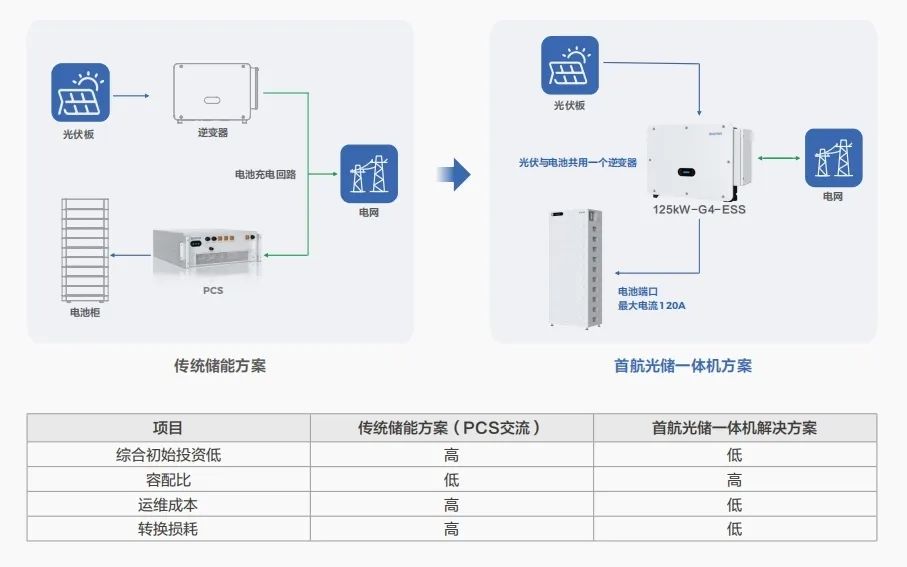 首航光儲(chǔ)一體機(jī)為?直流耦合儲(chǔ)能方案?,通過光伏組件直接接入儲(chǔ)能系統(tǒng),減少傳統(tǒng)交流耦合方案中的3次電能轉(zhuǎn)換環(huán)節(jié)中所帶來的電能損耗。系統(tǒng)效率提升5~10%以上,度電成本降低超10~15%。適用于自發(fā)自用(單多機(jī)防逆流、全額上網(wǎng)、并離網(wǎng)場(chǎng)景)。