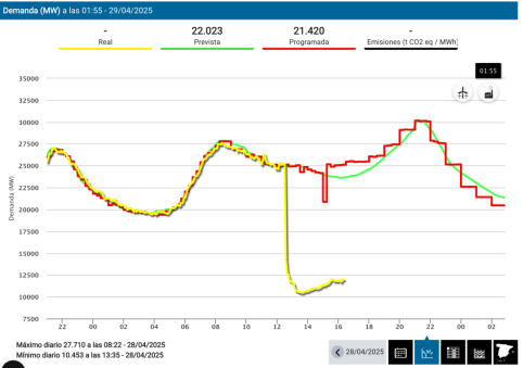 西班牙國(guó)家電網(wǎng)公司Red Eléctrica官網(wǎng)的運(yùn)行數(shù)據(jù)顯示,當(dāng)天中午十二點(diǎn)半左右,西班牙電網(wǎng)負(fù)荷從大約2500萬(wàn)千瓦驟降至約1400萬(wàn)千瓦,隨后一小時(shí)內(nèi)進(jìn)一步下降至約1000萬(wàn)千瓦,截至發(fā)稿,負(fù)荷緩慢恢復(fù)至約1200萬(wàn)千瓦,仍有大量電力供應(yīng)沒有恢復(fù)。