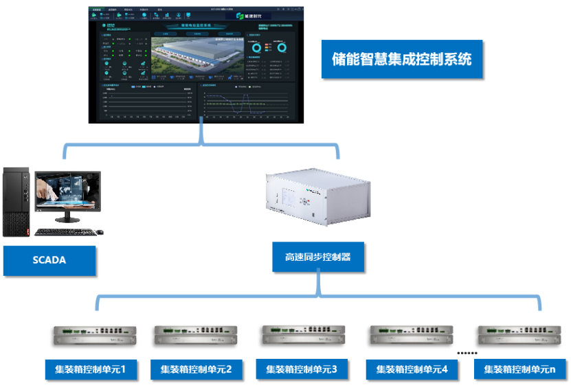 因此,我們希望能否提出一套儲(chǔ)能智慧集成控制系統(tǒng),通過(guò)SCADA和高速同步控制器,在每個(gè)集裝箱都有一個(gè)控制單元,把BMS、PCS以及消防、通信和主控,以及液冷系統(tǒng)的主控和通信,所有的這些都集成到一個(gè)集裝箱的控制單元里,通過(guò)之后的控制系統(tǒng)統(tǒng)一把集中商去協(xié)調(diào)的這些工作,統(tǒng)一交給這套系統(tǒng)去協(xié)調(diào)。