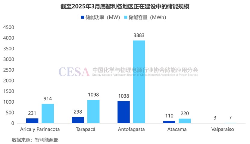 截至2025年3月31日,智利共有12個鋰電池儲能系統(tǒng)正在建設中,總規(guī)模1.68GW/6.122GWh,總投資21.4億美元(折合人民幣155.71億元),其中安托法加斯塔地區(qū)在建項目規(guī)模達1.038GW/3.883GWh,功率規(guī)模占比61.79%。