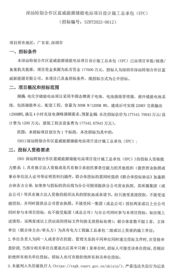 本招標(biāo)項目劃分為1個標(biāo)段,本次招標(biāo)為其中的(001)深汕特別合作區(qū)藍威能源儲能電站項目設(shè)計施工總承包(EPC)。