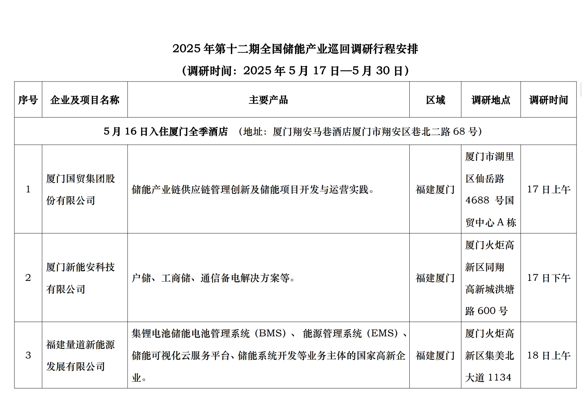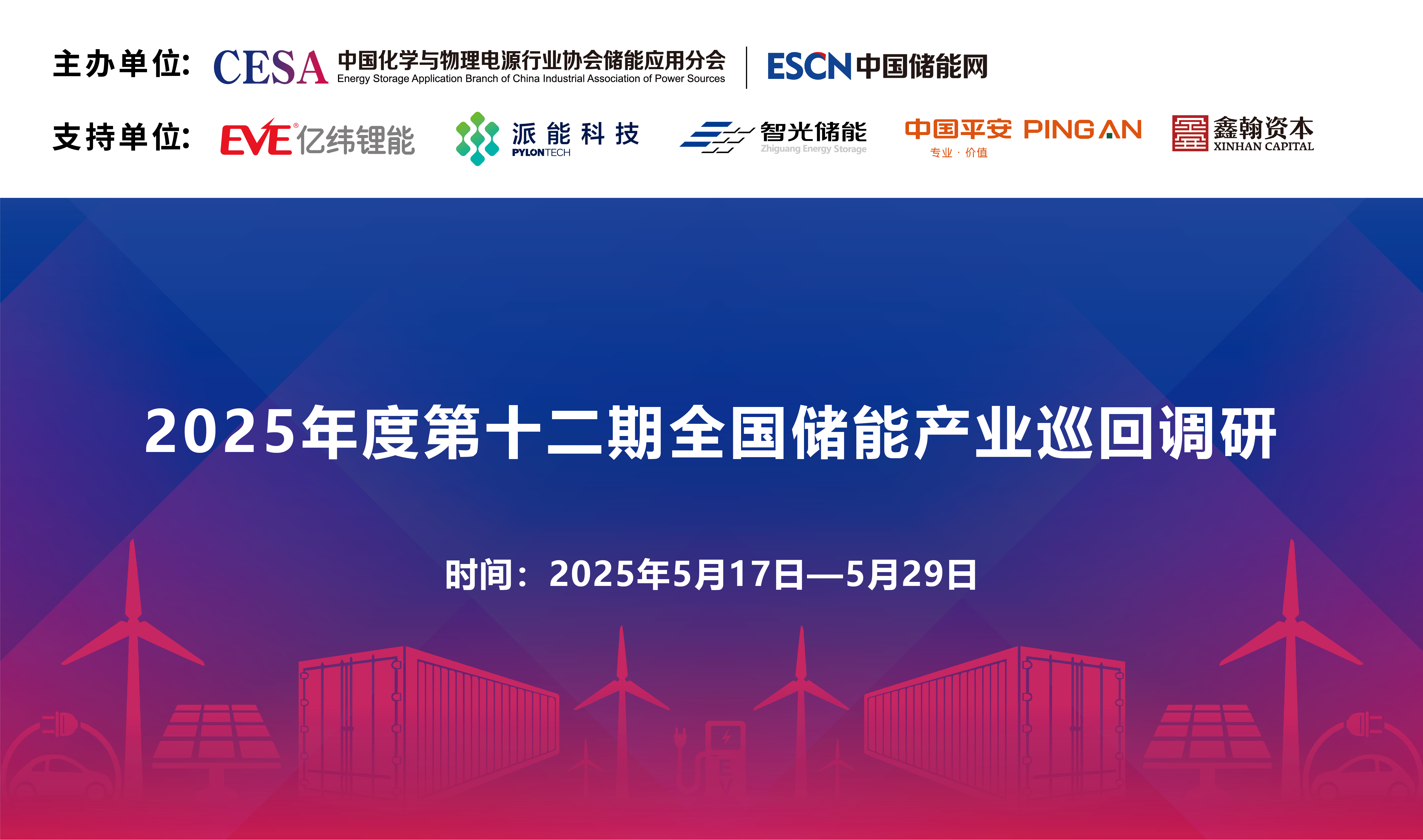 中國儲能網(wǎng)訊:為進一步做好“十五五”新型儲能產(chǎn)業(yè)發(fā)展規(guī)劃及了解當前儲能企業(yè)生產(chǎn)經(jīng)營現(xiàn)狀、生態(tài)鏈協(xié)同發(fā)展、行業(yè)內(nèi)卷、海外關(guān)稅及貿(mào)易壁壘、市場化商業(yè)模式、標準建設、政策機制等方面訴求,并向行業(yè)主管部門提出合理化建議。中國化學與物理電源行業(yè)協(xié)會儲能應用分會與中國儲能網(wǎng)決定將于5月17—29日組織開展2025年度第十二期全國儲能產(chǎn)業(yè)巡回調(diào)研工作,現(xiàn)將具體調(diào)研行程安排通知如下(最終行程以活動當天公布為準):