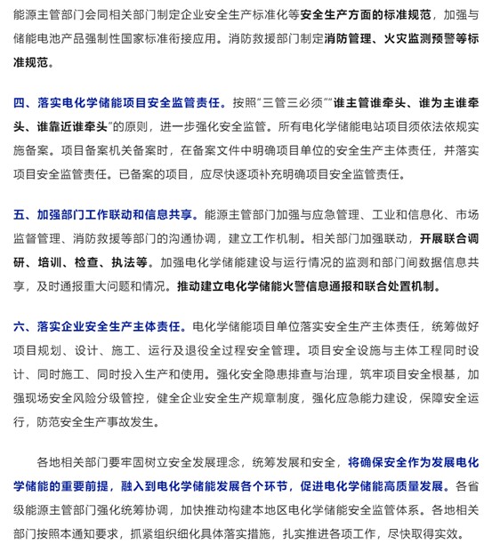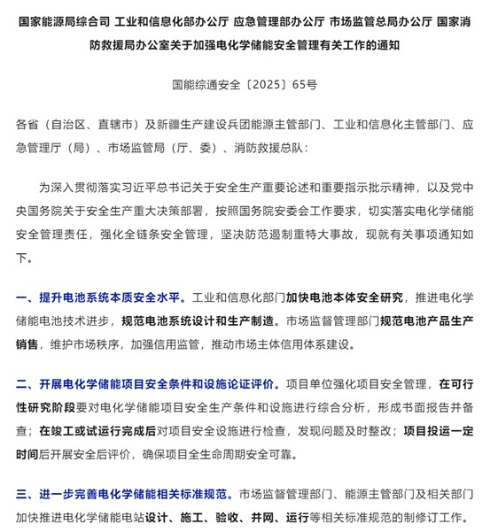 中國儲(chǔ)能網(wǎng)訊:5月7日,國家能源局網(wǎng)站發(fā)布了《關(guān)于加強(qiáng)電化學(xué)儲(chǔ)能安全管理有關(guān)工作的通知》,從電池系統(tǒng)本質(zhì)安全、項(xiàng)目論證評(píng)價(jià)、標(biāo)準(zhǔn)規(guī)范完善、監(jiān)管責(zé)任落實(shí)、部門聯(lián)動(dòng)機(jī)制到企業(yè)主體責(zé)任,六大維度勾勒出中國電化學(xué)儲(chǔ)能安全管理的升級(jí)路徑。