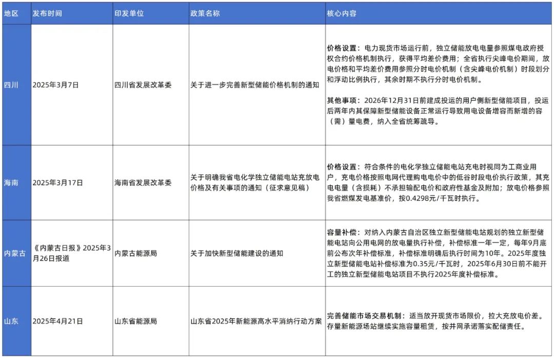 內(nèi)蒙古、河北實(shí)行獨(dú)立儲(chǔ)能容量補(bǔ)償政策。內(nèi)蒙古對(duì)納入規(guī)劃的獨(dú)立儲(chǔ)能向電網(wǎng)的放電量進(jìn)行補(bǔ)償,補(bǔ)償標(biāo)準(zhǔn)一年一定,補(bǔ)償標(biāo)準(zhǔn)明確后執(zhí)行時(shí)間為10年,2025年度的補(bǔ)償標(biāo)準(zhǔn)為0.35元/千瓦時(shí)。河北繼續(xù)執(zhí)行獨(dú)立儲(chǔ)能容量電價(jià)激勵(lì)機(jī)制,儲(chǔ)能電站按并網(wǎng)時(shí)間先后競(jìng)爭獲得容量補(bǔ)償,年度含稅容量電價(jià)為100元/千瓦,2024年已按容量電價(jià)激勵(lì)政策退坡機(jī)制執(zhí)行的儲(chǔ)能電站,年度容量電價(jià)追補(bǔ)至100元/千瓦。海南公布了《征求意見稿》的意見反饋情況,采納了出臺(tái)推動(dòng)新能源企業(yè)參與儲(chǔ)能容量租賃的政策、促進(jìn)獨(dú)立儲(chǔ)能容量租賃市場(chǎng)形成的建議,并提到后續(xù)將繼續(xù)推動(dòng)容量補(bǔ)償相關(guān)研究工作。