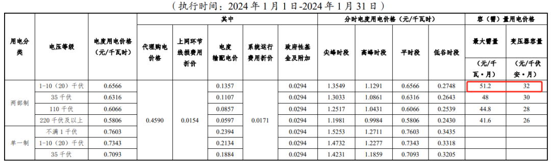 例如,某用戶執(zhí)行兩部制電價,變壓器容量315kW,電壓等級10kV,實際最大需量200kW,根據上圖可知需量電價為51.2元/kW*月。則基本電費為200*51.2= 10240元??梢?,此時基本電費并不比按容量計算時便宜(10080元)。