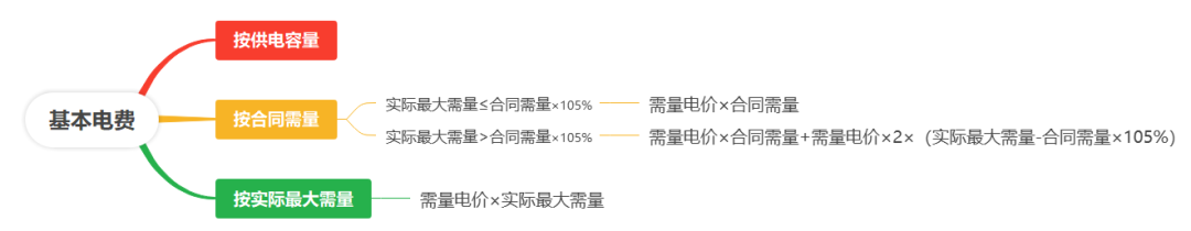 兩部制電價中的基本電費,又分為按供電容量計算、按實際最大需量計算、按合同最大需量計算三種方式。
