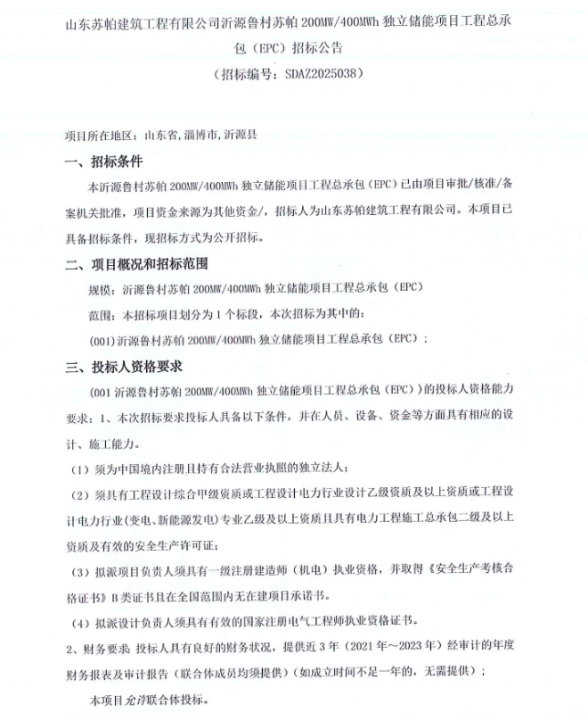 中國儲能網(wǎng)訊:5月8日,山東蘇帕建筑工程有限公司發(fā)布沂源魯村蘇帕200MW/400MWh獨立儲能項目EPC招標(biāo)公告,該項目位于山東省淄博市沂源縣。