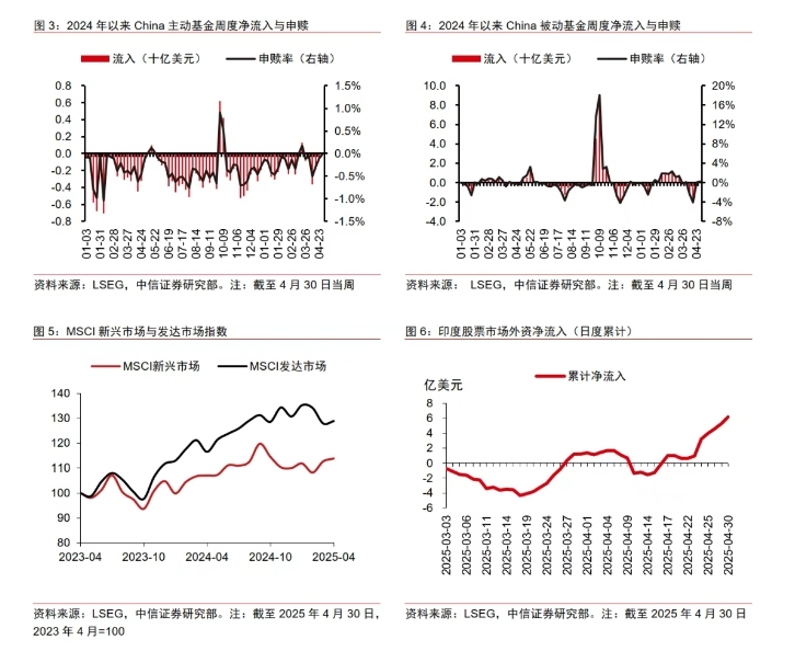 1)印度市場方面,外資在去年10月以來的持續(xù)流出后,于今年3月起流入,且這一趨勢在4月以后得到進(jìn)一步確認(rèn)。一方面,印度經(jīng)濟(jì)增長回暖,4月制造業(yè)PMI達(dá)10個月以來新高,緩解了投資者對印度長期經(jīng)濟(jì)增長中樞下移的疑慮。另一方面,雖然印度面臨26%的高額“對等關(guān)稅”,但美印貿(mào)易談判已取得顯著進(jìn)展,且印度自身經(jīng)濟(jì)以內(nèi)需驅(qū)動為主,在全球貿(mào)易擾動中韌性較強(qiáng)。