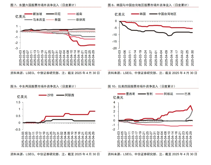 5)拉美四國市場(墨西哥、智利、阿根廷、巴西)方面,3月-4月外資流向有所分化。墨西哥未受本輪 “對等關(guān)稅”影響,或因特朗普對《美墨加協(xié)定》有其特殊考量,外資在關(guān)稅落地后顯著流入。巴西外資小幅流入,或受益于較低的稅率和其他國家在農(nóng)產(chǎn)品領(lǐng)域擺脫對美依賴的需求提振。阿根廷雖也僅面臨10%的全球基準(zhǔn)關(guān)稅,但其大幅放松資本管制政策使投資者擔(dān)憂比索或進(jìn)一步貶值,導(dǎo)致資金外流。