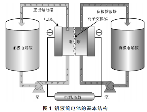 釩液流電池(Vanadium RedoxFlowBattery,VRFB)主要由電堆、正負(fù)極儲液罐、正負(fù)極電解液、正負(fù)極循環(huán)泵、離子交換膜以及流通管路組成。正極電解液和負(fù)極電解液分別儲存在獨立的儲液罐中,通過循環(huán)泵驅(qū)動電解液在儲罐與電堆之間循環(huán)流動。電堆是電池的核心反應(yīng)單元,由多層單體電池構(gòu)成,每個單體電池包含正負(fù)極電極和位于其間的離子交換膜。離子交換膜具備高選擇透過性,能阻隔正負(fù)極電解液的交叉混合,同時允許釩離子通過,以維持電化學(xué)反應(yīng)的電荷平衡。電解液在電極表面發(fā)生氧化還原反應(yīng),電化學(xué)能量利用外部電路轉(zhuǎn)化為電能輸出或進(jìn)行充電儲能。這種設(shè)計使得釩液流電池能有效平衡分布式能源系統(tǒng)中可再生能源發(fā)電的不穩(wěn)定性,優(yōu)化能量管理,提升系統(tǒng)的整體可靠性和運(yùn)行效率。釩液流電池的基本結(jié)構(gòu)如圖1所示。