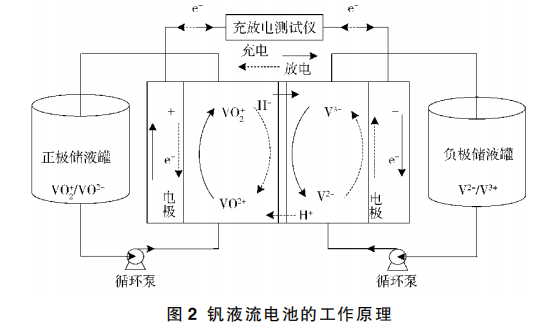 在上述過程中,循環(huán)泵用于保持電解液在儲液罐和電解池之間的流動,確保反應(yīng)的持續(xù)進(jìn)行??傮w而言,釩液流電池憑借其可逆的氧化還原反應(yīng)、高效的能量轉(zhuǎn)換及循環(huán)使用的特點,能在分布式能源系統(tǒng)中實現(xiàn)穩(wěn)定的儲能和電力供應(yīng)。釩液流電池的工作原理如圖2所示。