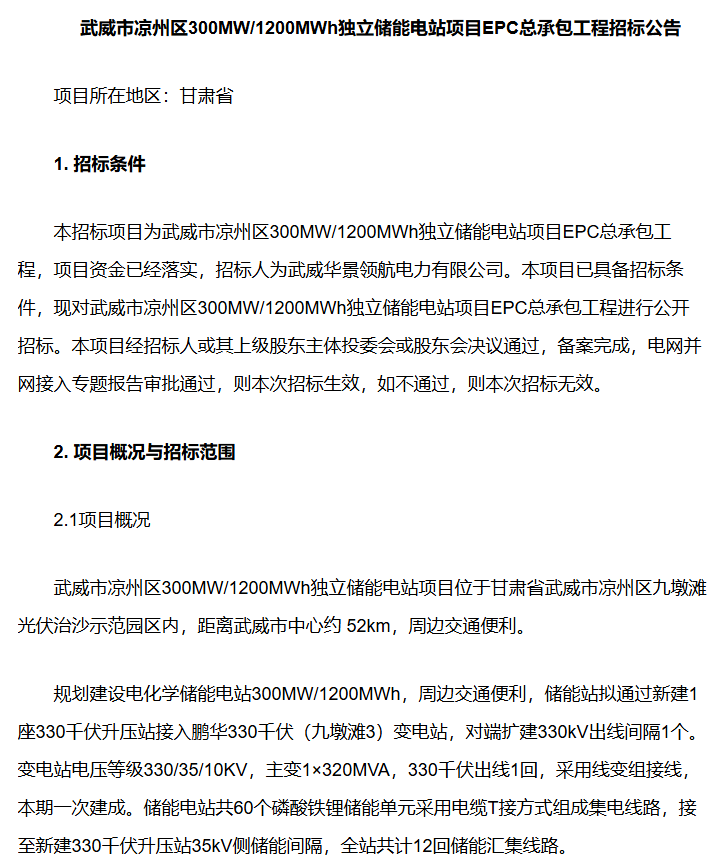 中國儲(chǔ)能網(wǎng)訊:5月8日,中國華能發(fā)布甘肅武威涼州區(qū)300MW/1200MWh獨(dú)立儲(chǔ)能電站項(xiàng)目EPC總承包工程招標(biāo)公告。