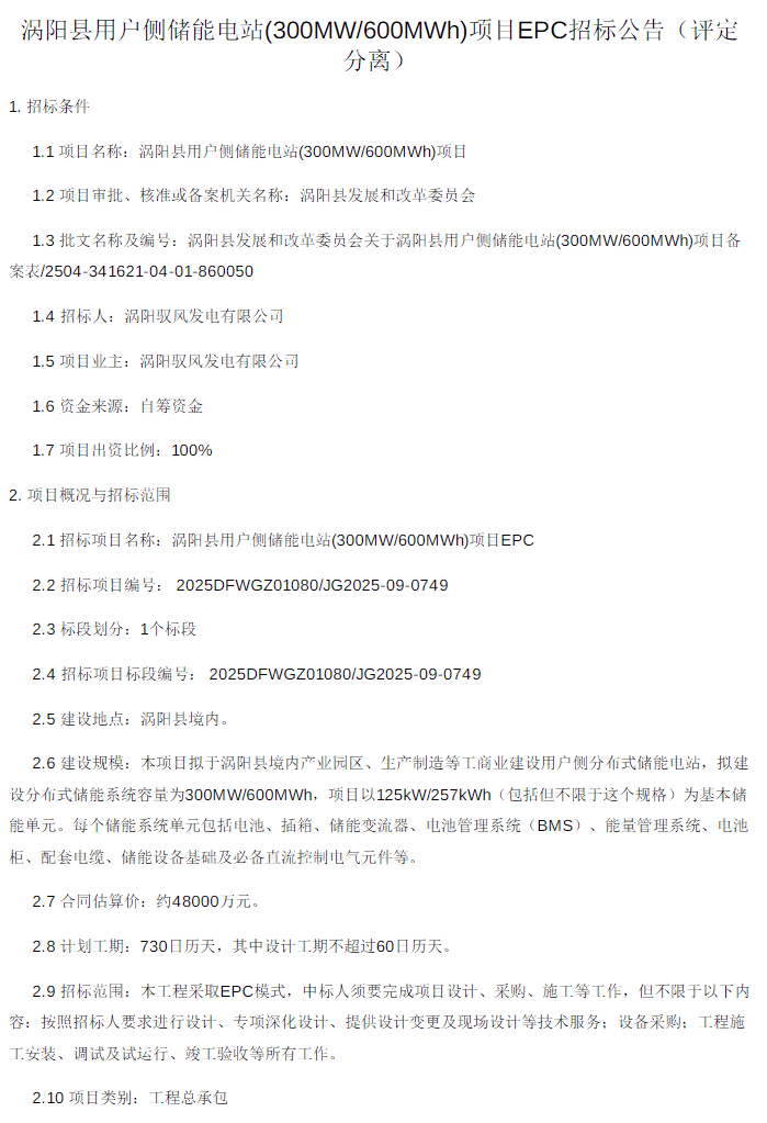 中國儲能網(wǎng)訊:5月13日,中國招投標公共服務平臺發(fā)布安徽亳州渦陽縣300MW/600MWh用戶側(cè)儲能電站EPC招標公告,項目招標人為渦陽馭風發(fā)電有限公司,資金來源為自籌資金。
