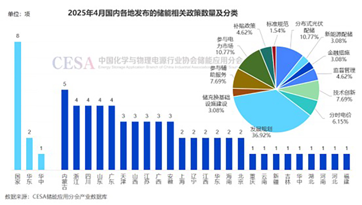 中國儲能網(wǎng)訊:據(jù)CESA儲能應(yīng)用分會產(chǎn)業(yè)數(shù)據(jù)庫不完全統(tǒng)計(jì),2025年4月份共發(fā)布儲能相關(guān)政策65項(xiàng),其中國家層面發(fā)布8項(xiàng),其中3項(xiàng)與參與電力市場有關(guān),2項(xiàng)涉及發(fā)展規(guī)劃,技術(shù)創(chuàng)新、儲充換基礎(chǔ)設(shè)施建設(shè)、參與輔助服務(wù)類政策各有1項(xiàng)。地方層面發(fā)布57項(xiàng)儲能相關(guān)政策。其中發(fā)展規(guī)劃類的最多,共22項(xiàng);涉及分布式光伏配儲的政策有7項(xiàng);參與電力市場類的有5項(xiàng);技術(shù)創(chuàng)新和分時電價(jià)的各有4項(xiàng)。此外,監(jiān)督管理、參與輔助服務(wù)市場、補(bǔ)貼等均有多項(xiàng)政策發(fā)布。從區(qū)域來看,四川、內(nèi)蒙古、浙江、山東、華東、華中等25個大區(qū)及省份發(fā)布了儲能相關(guān)政策。