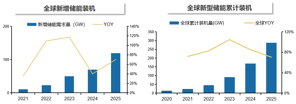 圖1 2020—2025年全球新型儲(chǔ)能新增裝機(jī)和累計(jì)裝機(jī)情況(2025年為預(yù)測(cè)值)
