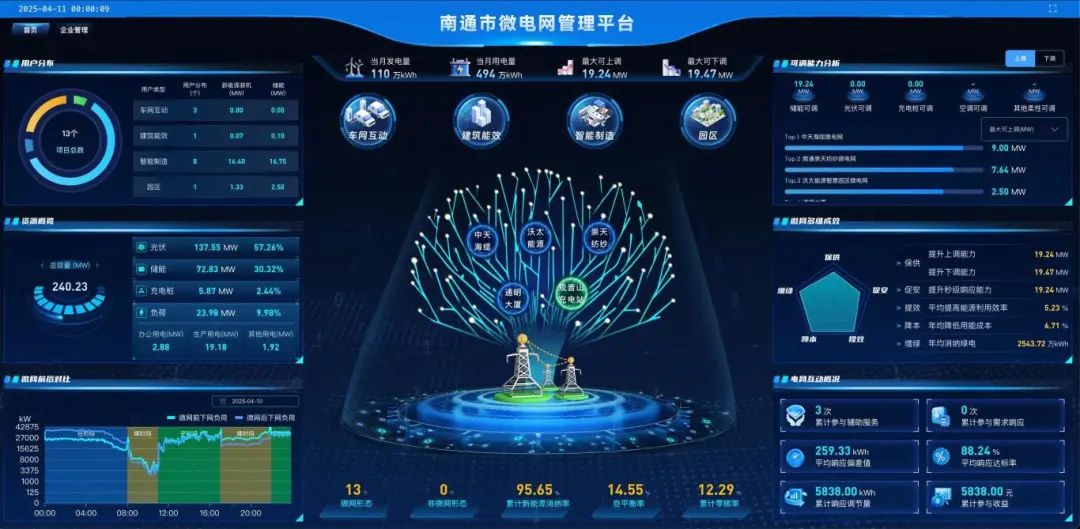 2025年4月中旬,國網(wǎng)南通供電公司承建的南通市微電網(wǎng)管理平臺正式上線運(yùn)行,在電網(wǎng)側(cè)可實現(xiàn)對全市微電網(wǎng)用戶的發(fā)展、資源規(guī)模進(jìn)行監(jiān)測,且能實時分析最大上調(diào)、下調(diào)能力,評估新能源消納率、自平衡率等運(yùn)營效益,這也是全省首個覆蓋“源網(wǎng)荷儲碳”全鏈條的市級微電網(wǎng)管理平臺。
