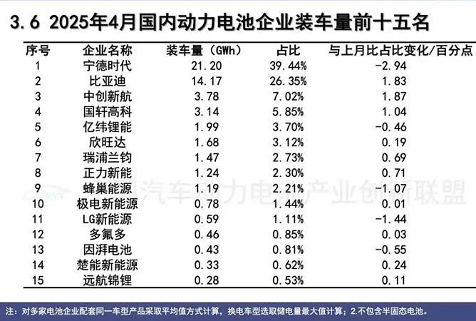 作為行業(yè)龍頭,寧德時(shí)代4月以21.2 GWh的裝車(chē)量穩(wěn)居榜首,但其市占率環(huán)比下滑2.94個(gè)百分點(diǎn)至39.44%,創(chuàng)2023年11月以來(lái)最低水平。