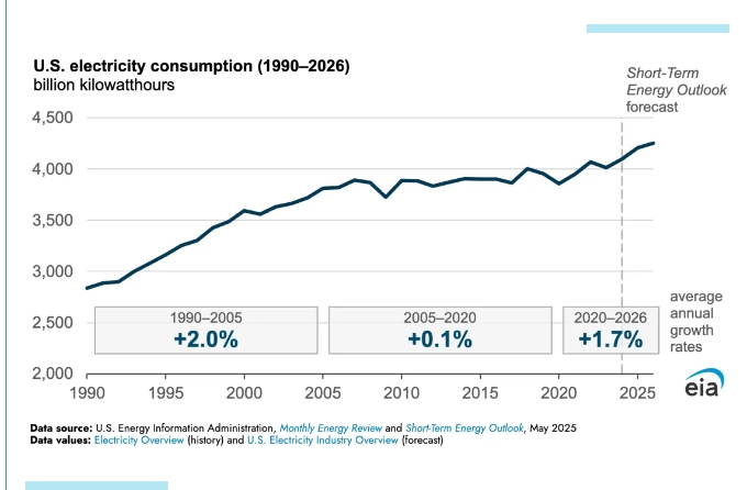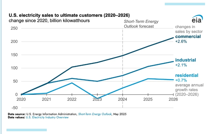 中國儲能網(wǎng)訊:根據(jù)美國能源信息署(EIA)預測,美國的年度電力消費將在2025年和2026年增加,并超過2024年創(chuàng)下的歷史新高。這一增長與2000年代中期到2020年代初相對平穩(wěn)的電力需求趨勢形成對比。最近和預測中的電力消費增長主要來自商業(yè)部門(包括數(shù)據(jù)中心)和工業(yè)部門(包括制造企業(yè))。