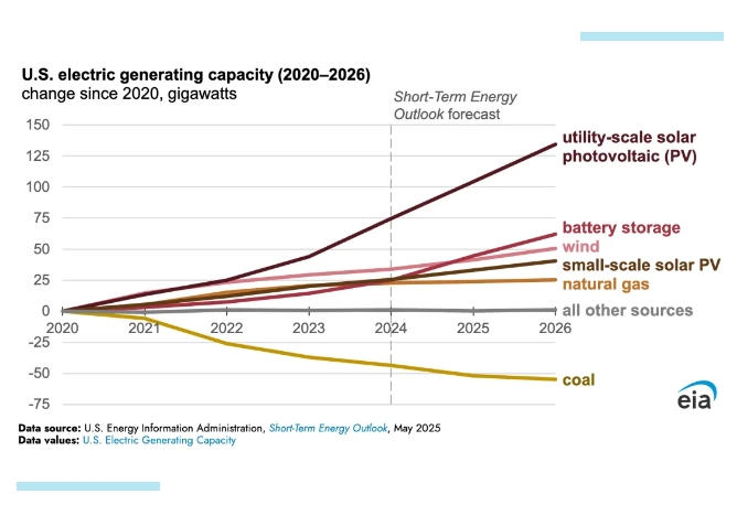 預計的電力需求增長正在推動發(fā)電能力和電力儲存的擴張。新增發(fā)電能力大多來自太陽能和電池儲能設施。新增發(fā)電能力集中在德克薩斯州、加利福尼亞州、中西部上游和東北部地區(qū)。