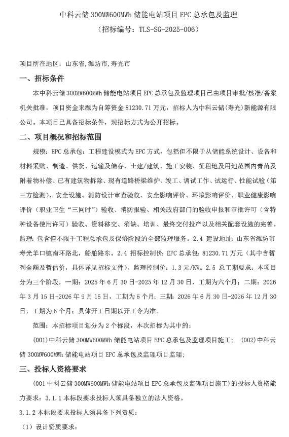 中國儲能網(wǎng)訊:5月17日,中科云儲(壽光)新能源有限公司啟動中科云儲300MW600MWh儲能電站項目EPC總承包及監(jiān)理招標。項目位于山東省濰坊市壽光市。