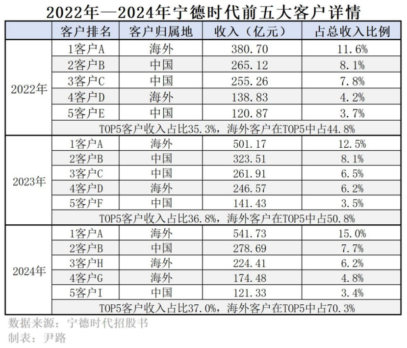 海外市場已經(jīng)成為寧德時代的關(guān)鍵增長極,2018年—2024年,其境外營收從不足10億元增至千億元以上,遠超境內(nèi)營收增速。到2023年,境外營收占比穩(wěn)定在30%以上,且2020年之后境外業(yè)務(wù)毛利率持續(xù)超出境內(nèi)業(yè)務(wù)5個百分點左右。2024年,寧德時代前五大客戶中海外客戶已占據(jù)三席。