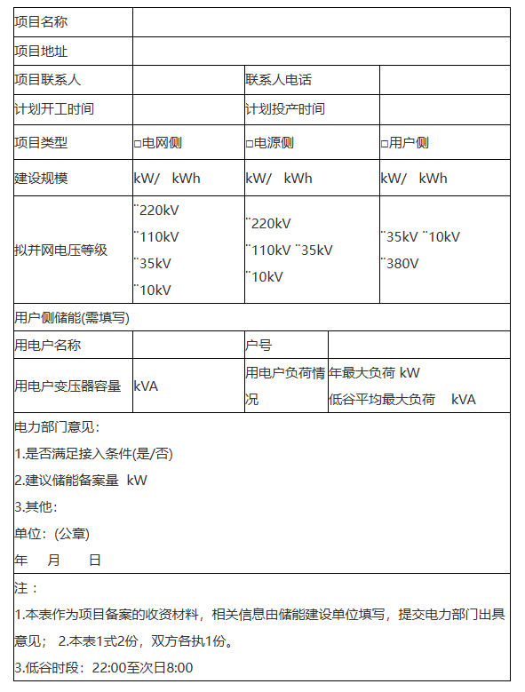 (六)新型儲能項目備案內容應包括:項目建設單位基本情況,項目名稱、建設地點、建設規(guī)模、建設內容(含技術線、應用場景等,并明確項目為電源側儲能、電網側儲能或用戶側儲能)、開工投產時間,項目總投資額,項目安全責任(明確項目單位的安全生產主體責任,并落實項目安全監(jiān)管責任),項目符合產業(yè)政策聲明。新型儲能項目須在備案前提供電網接入咨詢意見(附件2)。