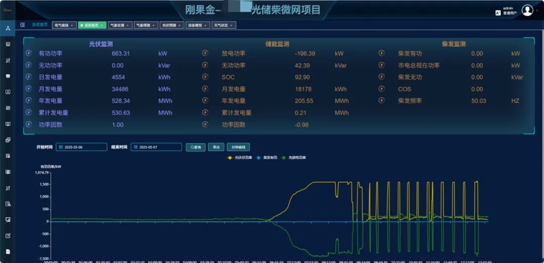 在試運行階段,該光儲柴微網(wǎng)系統(tǒng)表現(xiàn)出了卓越的性能。儲能系統(tǒng)夜間小功率放電滿足礦區(qū)生活用電需求,白天光伏開始發(fā)電后,儲能系統(tǒng)充電至保護(hù)上限后,EMS自動限制光伏功率,儲能放電,待限制時長結(jié)束后,光伏功率放開,儲能繼續(xù)充電。這一過程循環(huán)往復(fù),確保了系統(tǒng)的穩(wěn)定運行。同時,系統(tǒng)運行數(shù)據(jù)記錄完善,操作界面能夠完全控制系統(tǒng),并展示設(shè)備的實時運行數(shù)據(jù),隨時可以查詢。