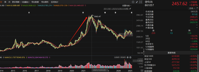 遙想2019年至2021年年底那波瘋狂的“鋰電池”行情,記憶猶新的就是碳酸鋰的價格一度走高至接近60萬/噸的天價,彼時僅國產(chǎn)新能源汽車爆發(fā)后的市場預期,就帶動了整個鋰電池產(chǎn)業(yè)鏈各種原材料價格的走高,比如當時有“新液體黃金”的六氟磷酸鋰在供給剛性的背景下,迎來價格上漲周期,半年時間從8萬元/噸快速上漲至40萬元以上,漲幅超過400%,最高曾突破60萬/噸。原材料上市公司受到“戴維斯雙擊”的利好影響,疊加機構(gòu)抱團,當年造就了一大批千億級別的上市公司。