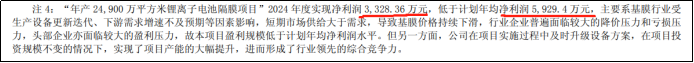 公司的隔膜基膜因設(shè)備也同樣遭到?jīng)_擊,隨著國產(chǎn)化加速,新進入者涌入市場,價格持續(xù)下挫。2024年公司的基膜項目“年產(chǎn)24900萬平方米鋰離子電池隔膜項目”,全年僅實現(xiàn)效益3328.36萬元,遠低于預期的5929.4萬元。