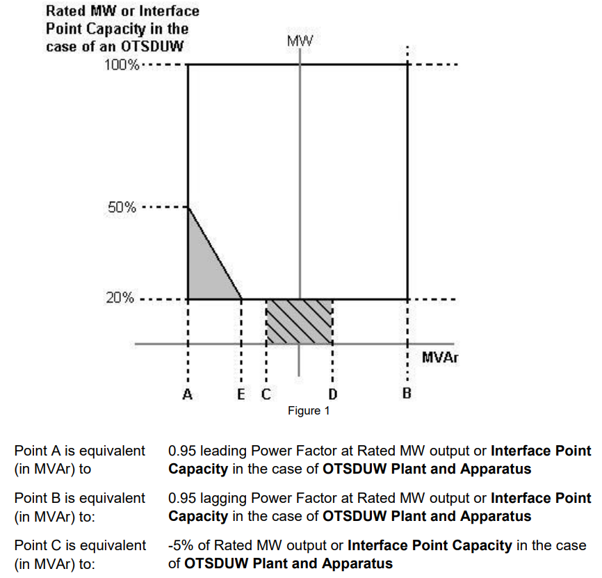 儲(chǔ)能需要在上圖所示的中壓電網(wǎng)接入點(diǎn)(GEP)滿(mǎn)足電網(wǎng)規(guī)范第ECC 6.3.2.4.4(c)節(jié)規(guī)定的無(wú)功功率能力。當(dāng)儲(chǔ)能需要在其最大容量以下運(yùn)行時(shí),它需要在50%和20%之間的三角形陰影區(qū)域運(yùn)行。此外,根據(jù)CC.6.3.2(b)節(jié),儲(chǔ)能必須能夠在穩(wěn)態(tài)電壓條件下的所有有功功率輸出水平上保持GEP的無(wú)功功率零轉(zhuǎn)移。無(wú)功功率轉(zhuǎn)移輸入和輸出的穩(wěn)態(tài)容差不得大于額定有功功率的5%。儲(chǔ)能必須能夠在CC.6.3.2(c)中定義的132kV及以上電壓的變壓器高壓側(cè)0.95PF滯后和領(lǐng)先極限之間的任何一點(diǎn),為20%以上的所有有功功率輸出水平是保證無(wú)功功率限制。