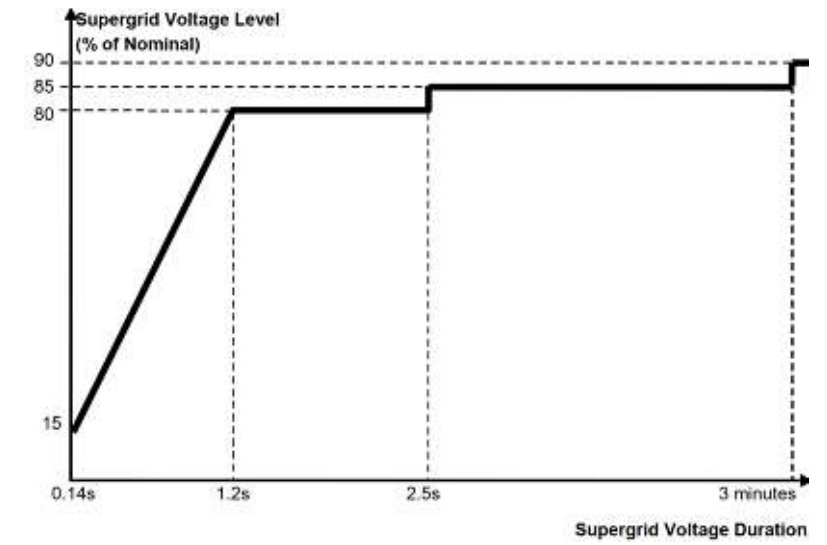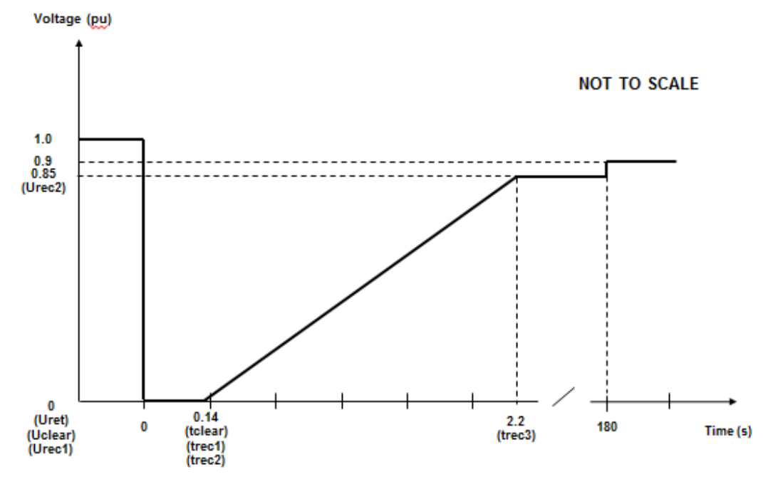 根據(jù)下圖所示的電壓曲線(xiàn)特征,BESS必須保持瞬時(shí)穩(wěn)定,并且在高壓側(cè)施加的平衡電壓跌落持續(xù)時(shí)間超過(guò)140毫秒時(shí),保證和電網(wǎng)連接而不跳閘。
