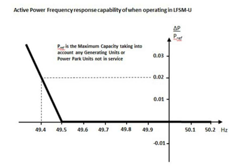 電網(wǎng)規(guī)范在ECC.6.3.7.2節(jié)中要求,每個(gè)BESS模塊必須在LFSM-U中保持穩(wěn)定,并且能夠在系統(tǒng)頻率低于49.5Hz時(shí)增加有功功率輸出。電網(wǎng)規(guī)范不允許BESS在低效(長(zhǎng)延時(shí))模式下運(yùn)行以促進(jìn)LFSM-U響應(yīng)的傳遞;任何固有的能力(如果有的話(huà))應(yīng)在盡可能短的時(shí)間內(nèi)傳遞。如下圖所示,有功功率輸出的變化率必須是在系統(tǒng)頻率低于49.5Hz時(shí),每偏離0.1Hz至少有2%的輸出(即10%的下降)。在頻率低于49.5Hz時(shí),必須實(shí)現(xiàn)有功功率的比例增長(zhǎng)。BESS應(yīng)能以盡可能短的初始延遲啟動(dòng)功率頻率響應(yīng)。如果延遲超過(guò)2秒,則必須提供技術(shù)證據(jù)來(lái)證明這種變化。要求BESS能提供高達(dá)其最大容量的功率增長(zhǎng)。