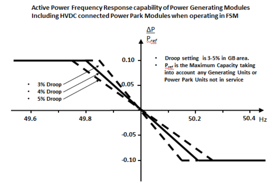電網(wǎng)規(guī)范在ECC.6.3.7.3.1節(jié)中指出,BESS必須安裝一個(gè)快速反應(yīng)的比例頻率控制裝置,能夠在正常運(yùn)行條件下提供頻率響應(yīng)。頻率控制裝置必須在下圖所示的有功功率輸出的整個(gè)運(yùn)行范圍內(nèi)運(yùn)行。