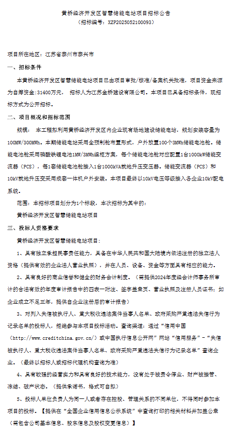 中國(guó)儲(chǔ)能網(wǎng)訊:5月21日,江蘇省泰州市泰興市黃橋經(jīng)濟(jì)開(kāi)發(fā)區(qū)100MW/300MWh智慧儲(chǔ)能電站項(xiàng)目招標(biāo)公告發(fā)布。招標(biāo)人為江蘇金橋建設(shè)有限公司,項(xiàng)目資金來(lái)源為自籌資金31400萬(wàn)元,折合單價(jià)約1.05元/Wh。