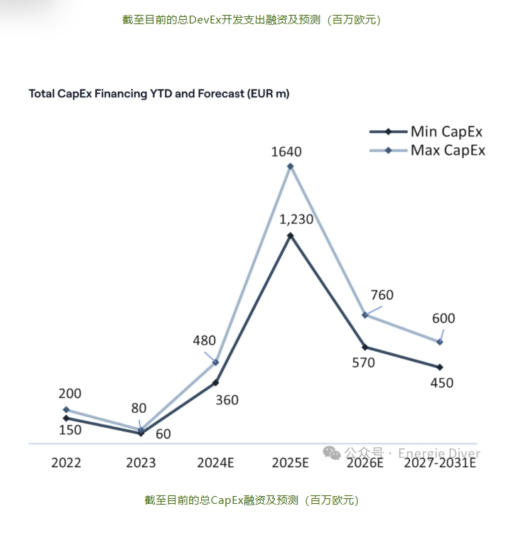 考慮到DevEx項目開發(fā)支出將主要通過股權融資的形式獲得資金支持,而儲能及新能源項目投資主要通過債券融資完成70%項目支出的配資活動,我們預測了以下儲能項目開發(fā)股權和儲能項目投資債權的資本需求。