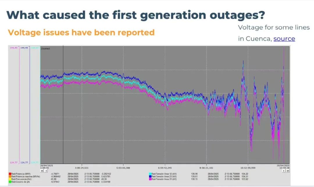 在此過程中,頻率損失速度最大約為0.8Hz/s,沒有超過2Hz/s的界限(歐盟規(guī)定);西班牙電網(wǎng)與主網(wǎng)的相角差持續(xù)擴大,但根據(jù)ENTSO-E數(shù)據(jù),系統(tǒng)并未因此立即解列,而是在大量發(fā)電功率驟減后才發(fā)生電網(wǎng)解列。需要指出的是,在故障的關鍵階段,頻率下降的幅度和速度均未觸發(fā)保護閾值,因此電網(wǎng)沒有通過切斷負荷應對沖擊,這側面印證了頻率問題與此次停電事故不一定有直接的因果關系。