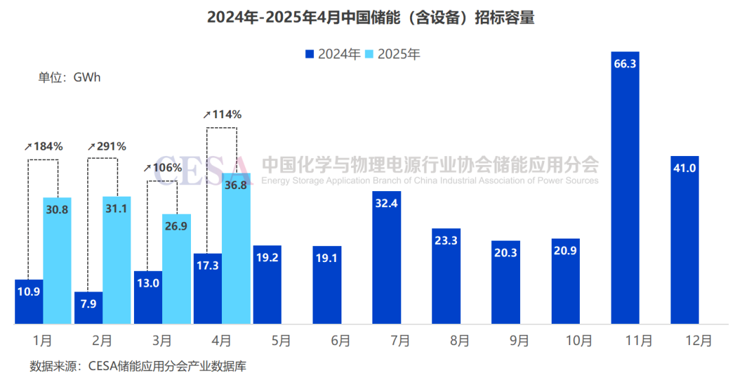 據(jù)CESA儲(chǔ)能應(yīng)用分會(huì)產(chǎn)業(yè)數(shù)據(jù)庫(kù)不完全統(tǒng)計(jì),2025年1-4月,國(guó)內(nèi)儲(chǔ)能EPC/PC(含直流側(cè)設(shè)備)、儲(chǔ)能系統(tǒng)、儲(chǔ)能電池采購(gòu)等招標(biāo)規(guī)模已高達(dá)34.52GW/125.6GWh,容量規(guī)模同比增長(zhǎng)156%。