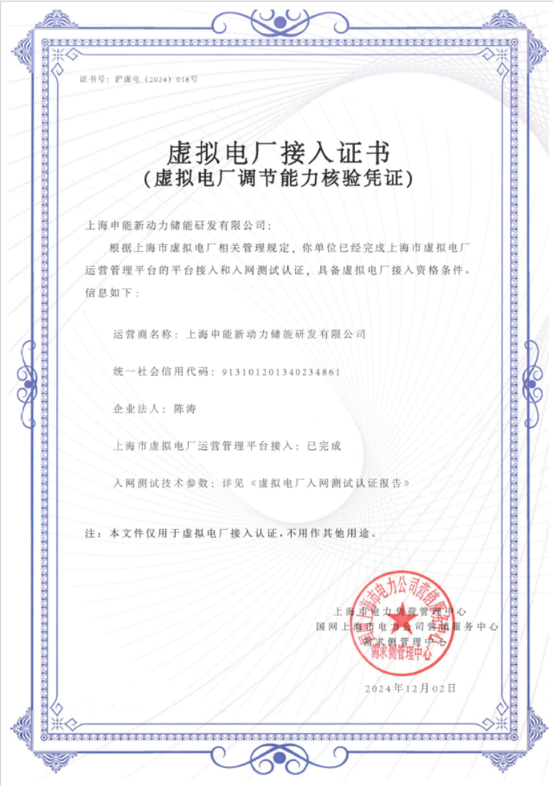 2024年,為規(guī)范虛擬電廠注冊及運(yùn)行流程,上海電力交易中心發(fā)布《上海市虛擬電廠注冊指引(試行)》文件,虛擬電廠運(yùn)營商需通過電網(wǎng)負(fù)荷管理中心或電網(wǎng)調(diào)控中心安排專業(yè)資質(zhì)檢測并獲取相應(yīng)報告。申能儲能迅速響應(yīng)號召,8月14日配合電網(wǎng)開展測試,采用云邊結(jié)合形式,當(dāng)日便通過專業(yè)機(jī)構(gòu)檢測,并于12月2日獲取《虛擬電廠調(diào)節(jié)能力核驗憑證》(見圖2)及《虛擬電廠入網(wǎng)測試認(rèn)證報告》,成為上海市首批獲得調(diào)節(jié)能力校驗憑證的負(fù)荷聚合商。