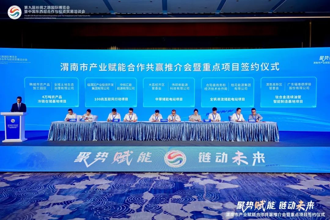 中國儲能網(wǎng)訊:5月21日,在第九屆絲博會召開之際,渭南市產(chǎn)業(yè)賦能合作共贏推介會暨重點(diǎn)項(xiàng)目簽約儀式在西安舉行,渭南市委書記樊維斌、市長陳曉勇等出席活動。會上,陜西桂花能源集團(tuán)有限公司作為新型儲能領(lǐng)域的領(lǐng)軍企業(yè),與渭南市合陽縣正式簽約合陽縣80MW/320MWh全釩液流儲能電站項(xiàng)目。