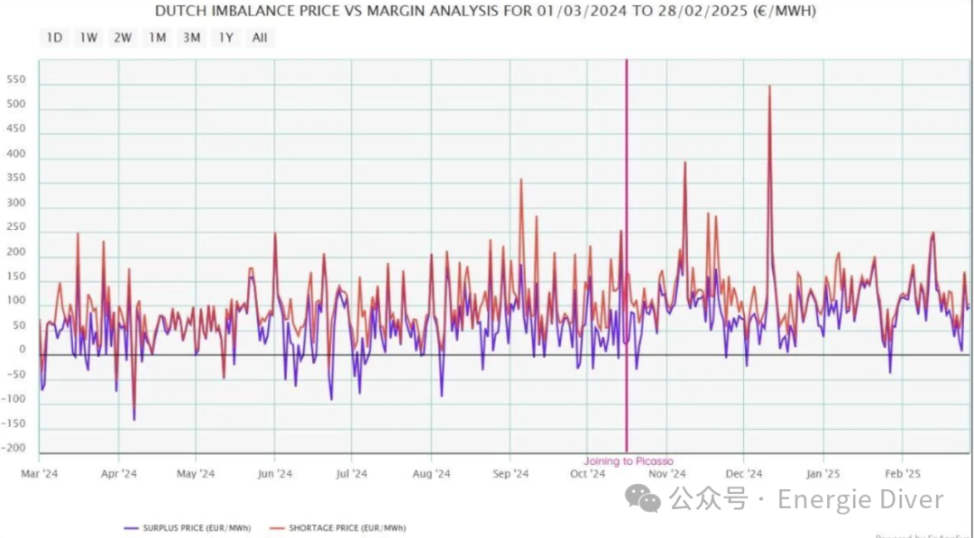 荷蘭于2024年10月加入了歐洲跨境平衡平臺PICASSO(針對aFRR)。此后,荷蘭能源市場的不平衡價格波動顯著減少,峰值不平衡價格也有所下降。然而,如果荷蘭及鄰國同時面臨能源短缺,不平衡價格可能會被放大。下圖顯示了12月11日至12日期間因“暗池”(Dunkelflaute)事件導(dǎo)致的這一情況。