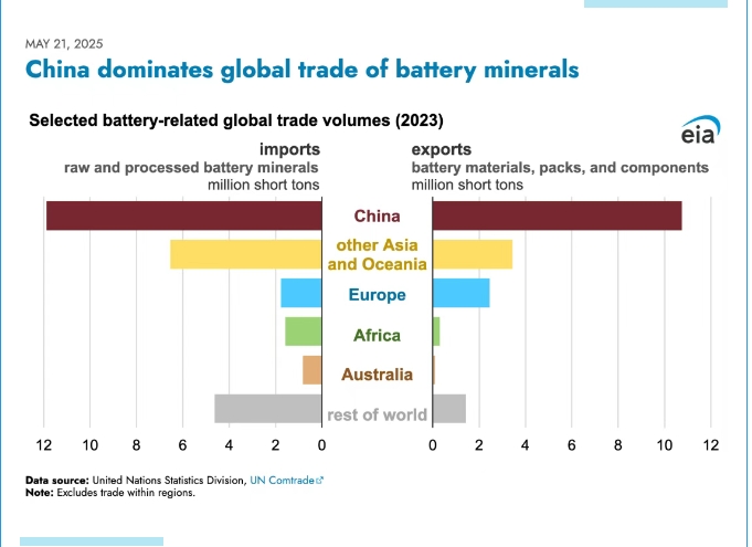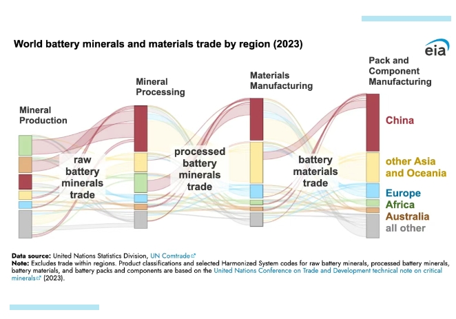 中國儲能網(wǎng)訊:美國能源信息署發(fā)表文章:中國在全球電池供應(yīng)鏈的每個環(huán)節(jié)都發(fā)揮著重要作用,并且主導(dǎo)著礦物的區(qū)域間貿(mào)易。