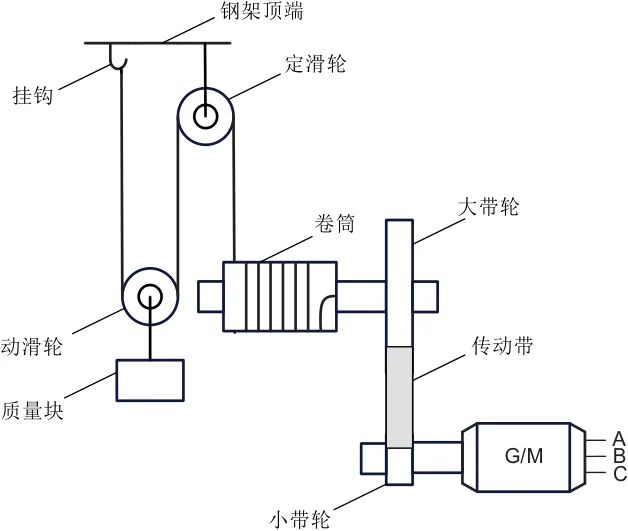 系統(tǒng)主要由質量塊、發(fā)電/電動機、傳動裝置、曳引裝置和鋼架五大部分組成,其中傳動裝置由大帶輪、傳動帶和小帶輪組成,曳引裝置則由卷筒和鋼絲繩組成。質量塊是重力勢能的儲存單元,發(fā)電/電動機是系統(tǒng)進行機電能量轉換的核心,而傳動裝置用于在高轉速、小轉矩的電機側與低轉速、大轉矩的機械側之間建立聯(lián)系,曳引裝置用于執(zhí)行質量塊的升降,鋼架的高度則決定了質量塊升降的最大高度差。