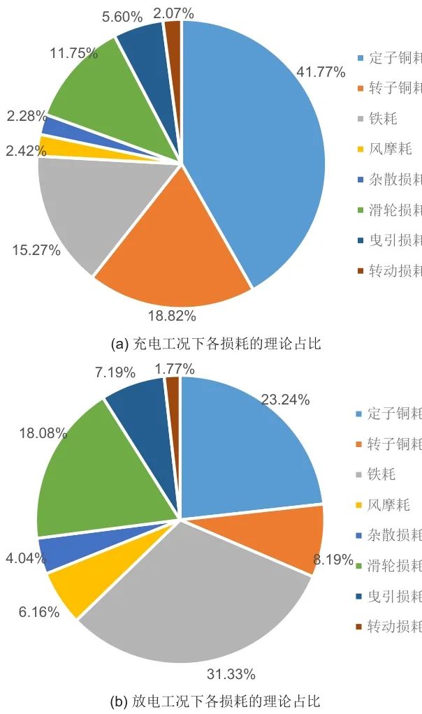 由圖2可知,放電工況下機械損耗占比與充電工況相比明顯升高,且滑輪損耗在機械損耗中主導地位,而傳動損t耗僅占極小部分。