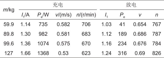 在得到機械環(huán)節(jié)綜合效率的基礎上,針對一臺1.1 kW、380 V、4對極、定子△接的籠型異步電機,根據(jù)其機械特性和系統(tǒng)各部分之間的速度關聯(lián)關系,得到充電時電機轉差率為0.14,轉速為645 r/min,質量塊運行速度為0.542 m/s,并得到對應的滑輪損耗為83.93 W,曳引損耗為40.02 W,傳動損耗為14.8 W;放電時電機的轉差率為-0.068,轉速為801 r/min,質量塊運行速度為0.694 m/s,對應的系統(tǒng)滑輪損耗為96.76 W,曳引損耗為38.46 W,傳動損耗為9.48 W。