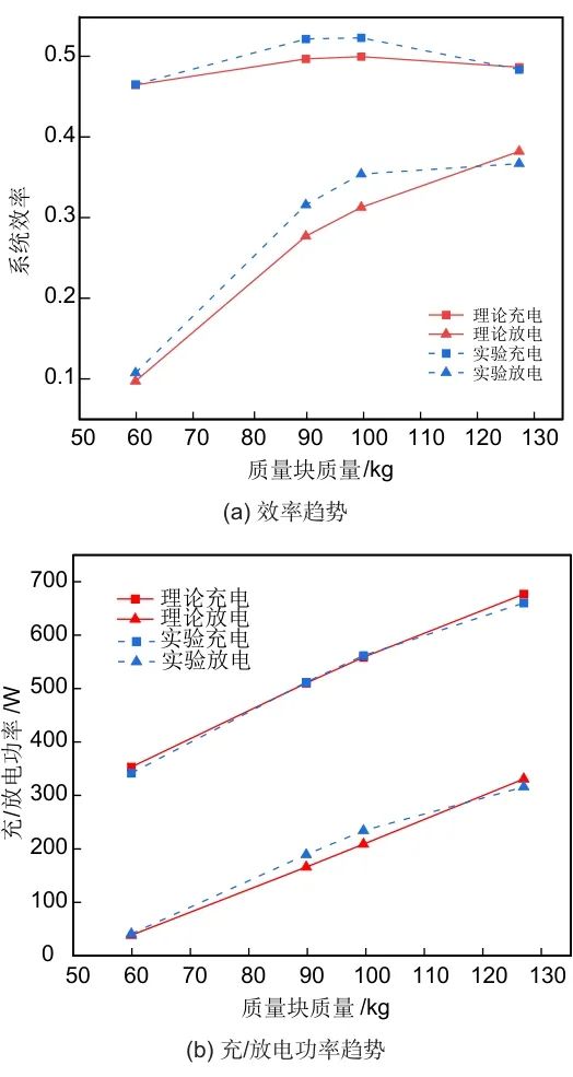 根據(jù)實驗數(shù)據(jù)對計算不同質量塊質量下的系統(tǒng)充/放電效率及功率,與理論結果比較,如圖4所示。