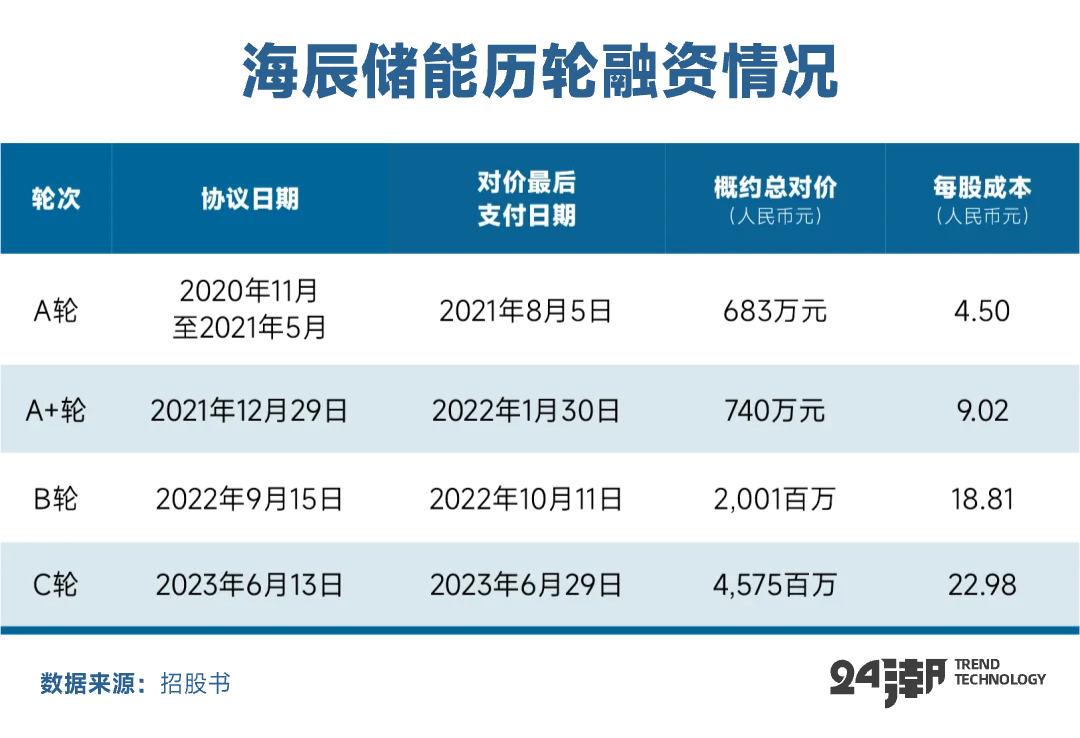 上市前,海辰共進行了四輪融資,A輪融資6.83億元,A+輪融資7.4億元,B輪20.01億元,C輪45.75億元,累計融資80億元。以C輪每股22.98元計算,目前其估值超過250億元。