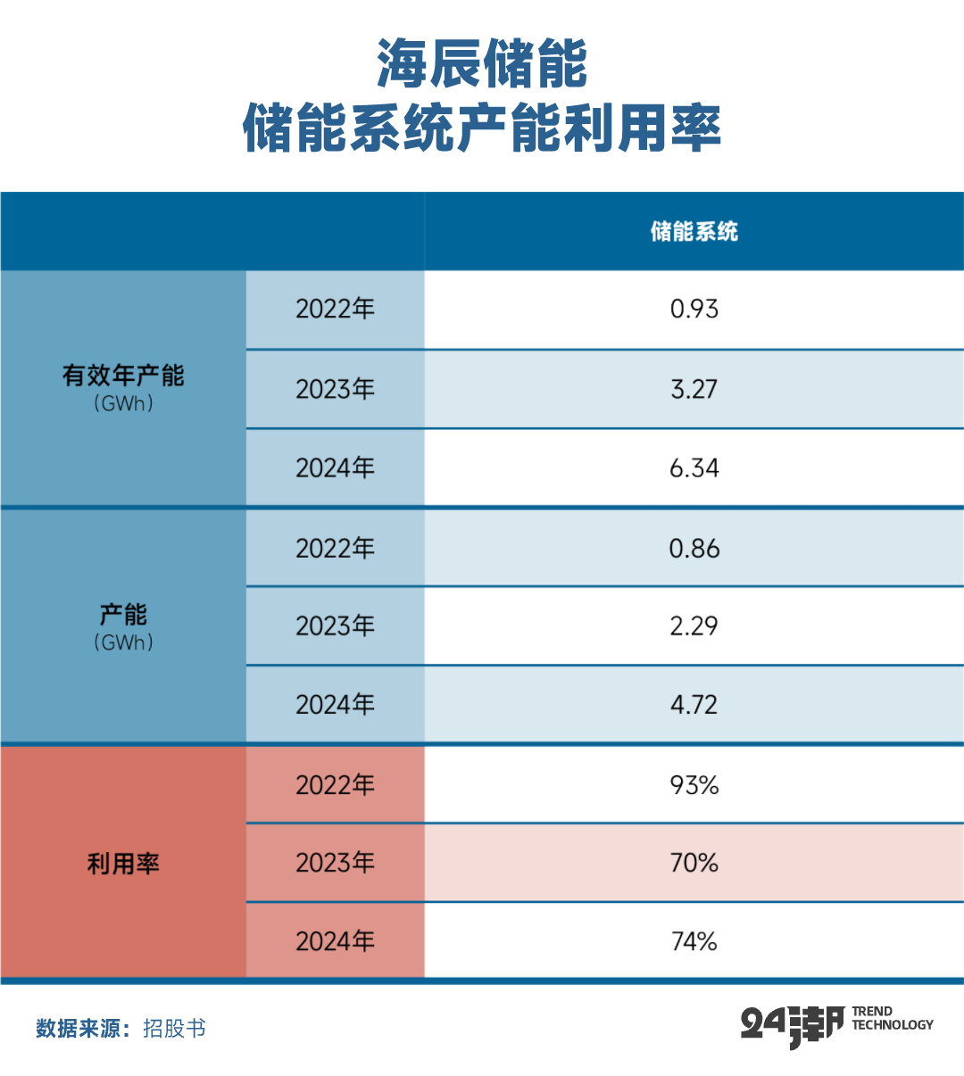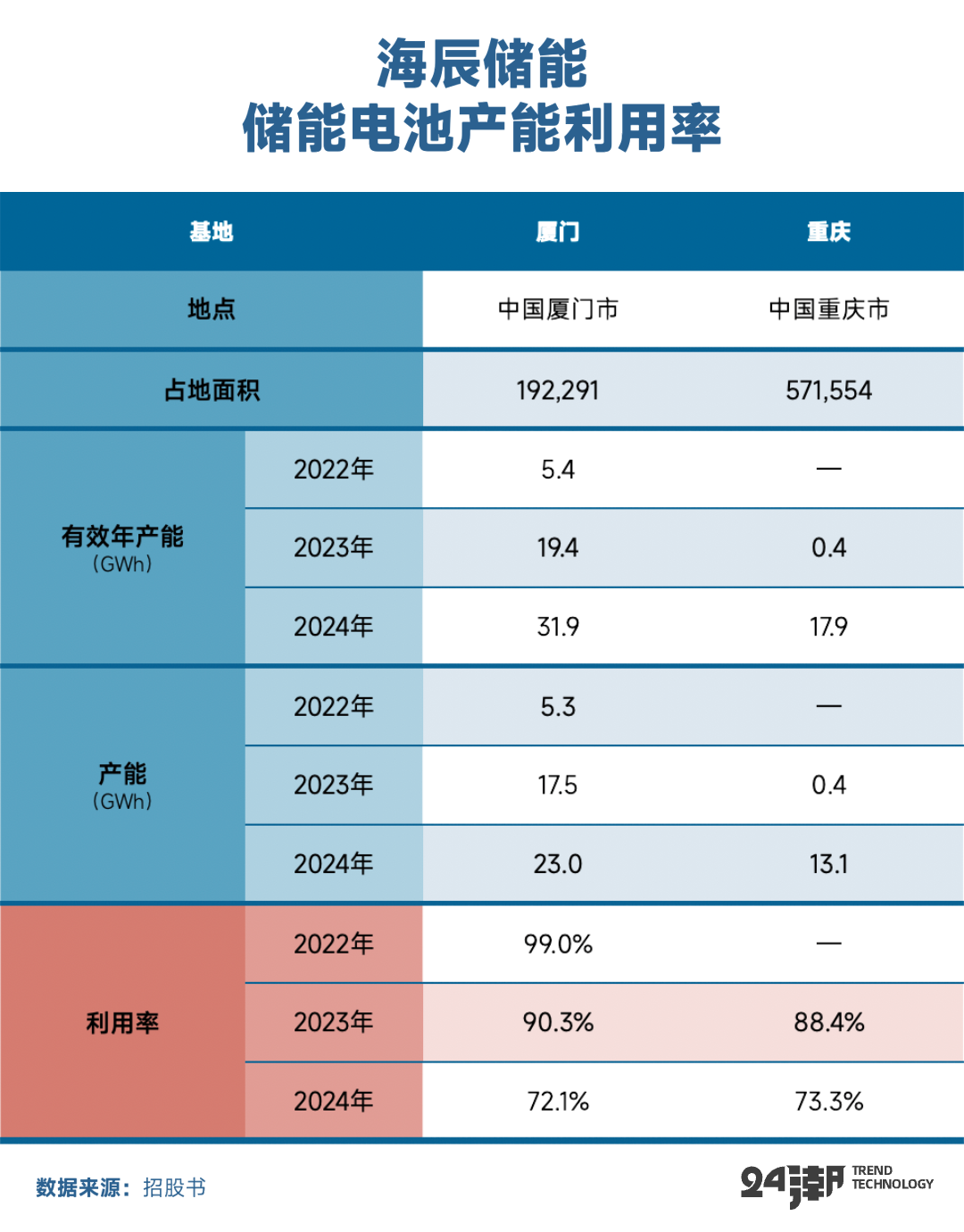 全行業(yè)豪賭之下,海辰儲能面臨產(chǎn)能擴張和利用率下滑的窘境。過去三年,廈門基地產(chǎn)能利用率一路從99%下滑至72.1%;重慶基地從2023年的88.4%下降至73.3%;儲能系統(tǒng)產(chǎn)能利用率從93%下降到74%。