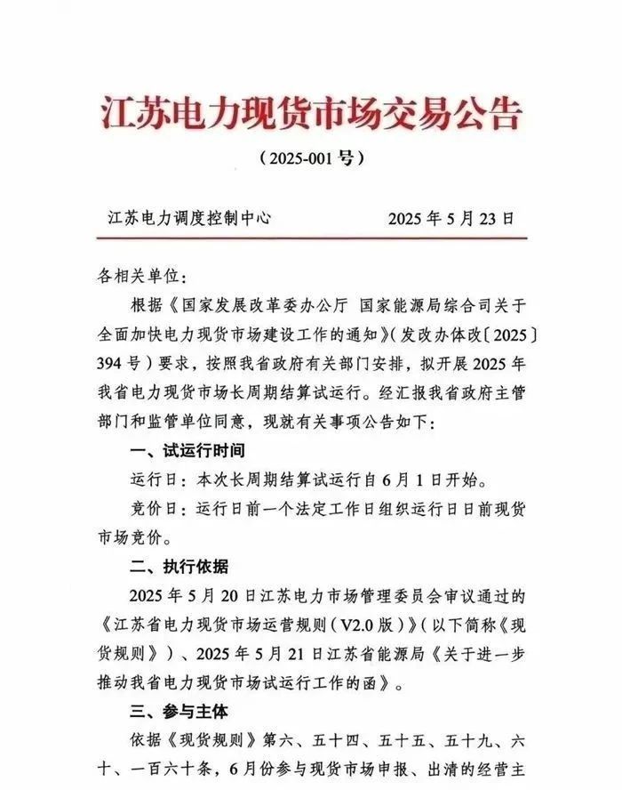 中國儲(chǔ)能網(wǎng)訊:近日,江蘇電力調(diào)度控制中心下發(fā)江蘇電力現(xiàn)貨市場交易公告。其表示,根據(jù)《國家發(fā)展改革委辦公廳國家能源局綜合司關(guān)于全面加快電力現(xiàn)貨市場建設(shè)工作的通知》發(fā)改辦體改[2025394號(hào))要求,按照我省政府有關(guān)部門安排,擬開展2025年我省電力現(xiàn)貨市場長周期結(jié)算試運(yùn)行。