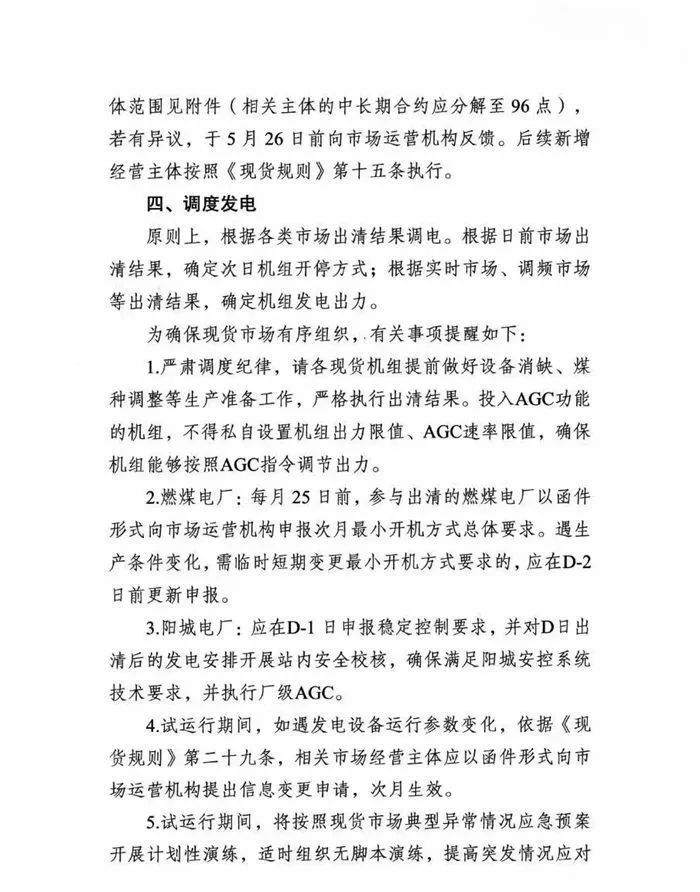 1.嚴(yán)肅調(diào)度紀(jì)律,請各現(xiàn)貨機(jī)組提前做好設(shè)備消缺、煤種調(diào)整等生產(chǎn)準(zhǔn)備工作,嚴(yán)格執(zhí)行出清結(jié)果。投入AGC功能的機(jī)組,不得私自設(shè)置機(jī)組出力限值、AGC速率限值,確保機(jī)組能夠按照AGC指令調(diào)節(jié)出力。